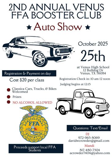 The Venus FFA Booster Club is dedicated to empowering students in agriculture. We provide support through fundraising efforts, scholarships, and hands-on learning experiences.